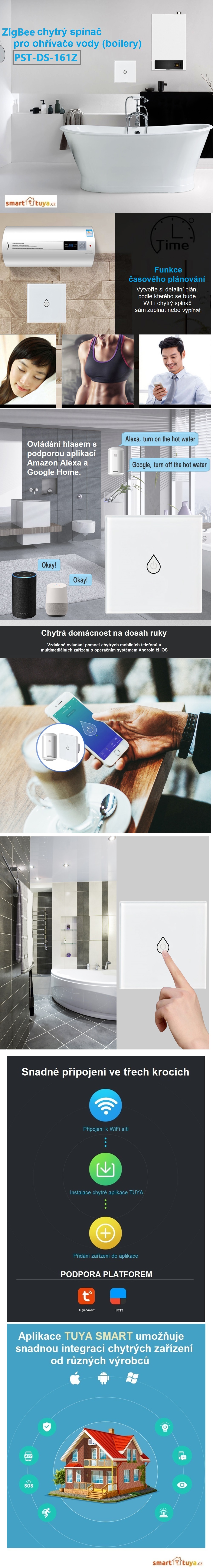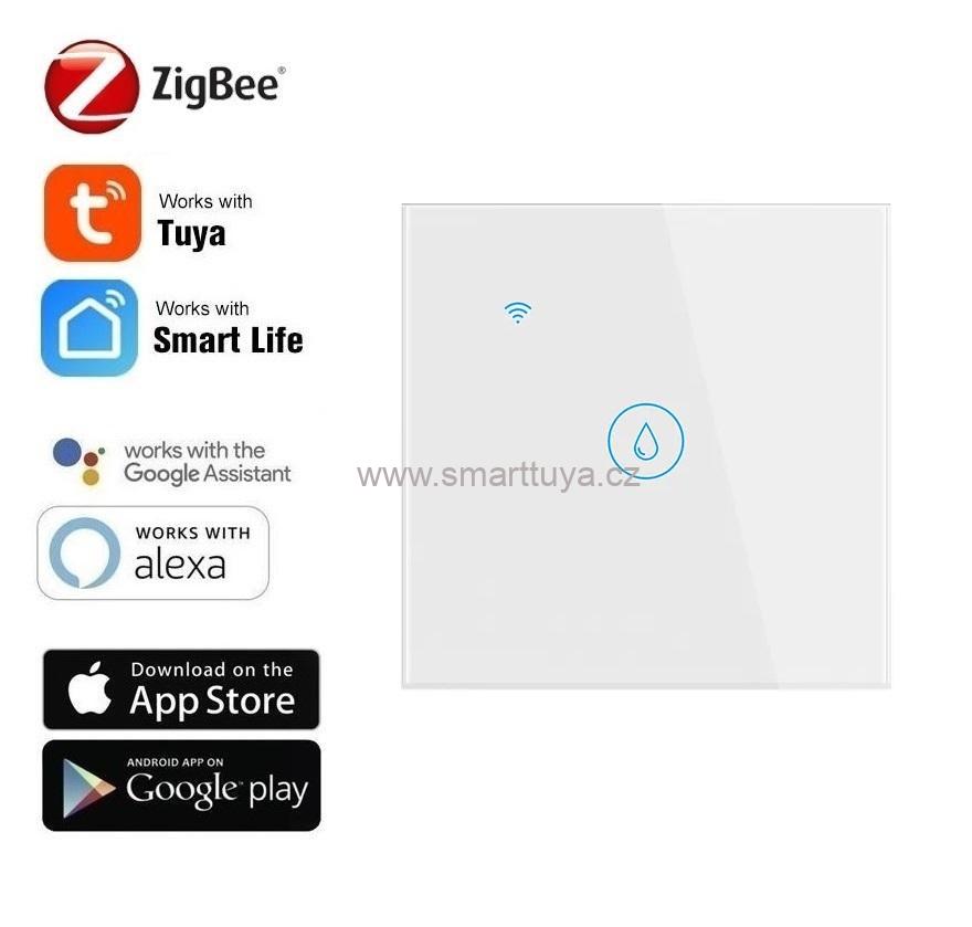 Dotykový inteligentní spínač umožní pohodlně ovládat ohřev vodyv domácnosti přes centrální jednotky/Tuya Zigbee Hub přes protokol ZigBee 3.0. a mobilní aplikaci. Skleněný povrch je vybaven jedním tlačítkem s možností manuálního ovládání a nechybí ani podpora hlasových služeb Amazon Alexa a Google Assistant. Vypínač má jemné podsvícení ve tvaru kruhu, který je možno ovládat i ve tmě.