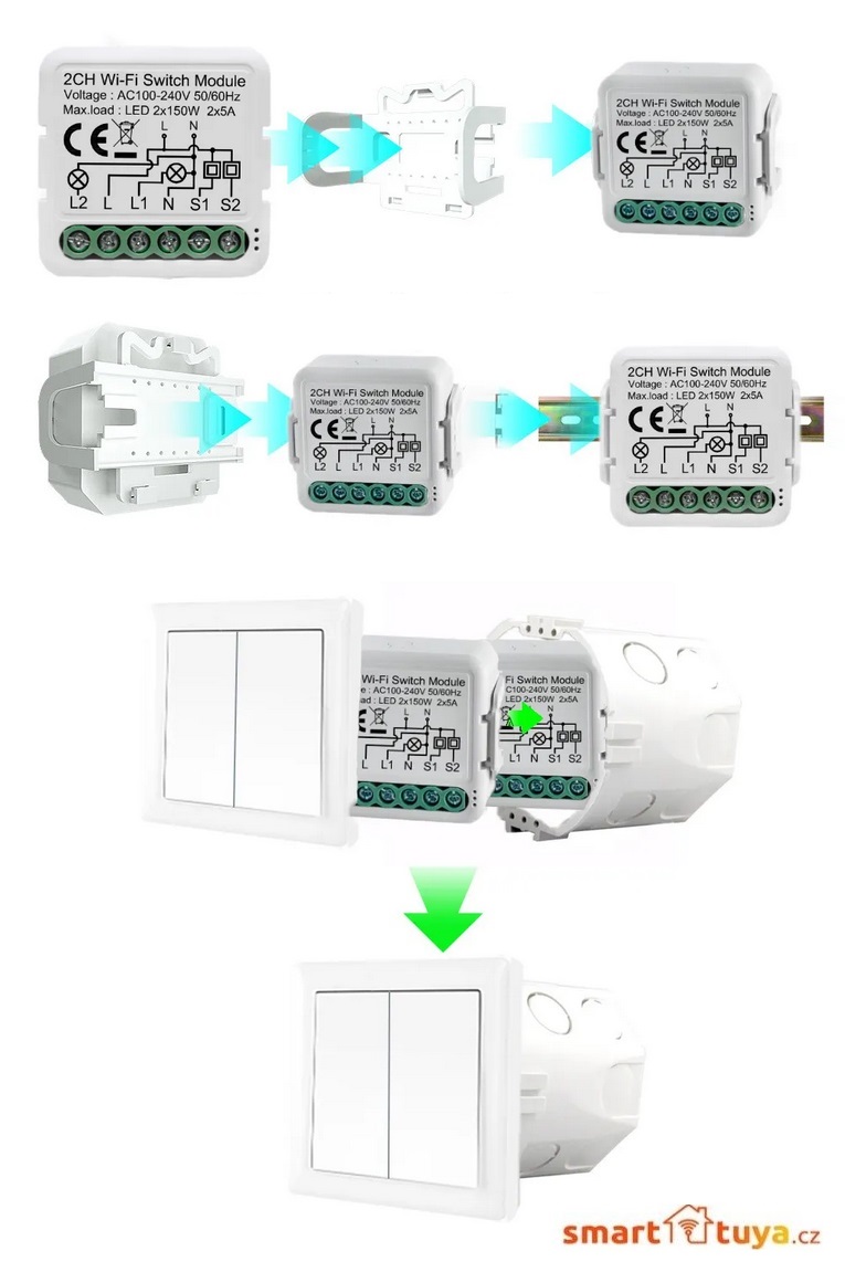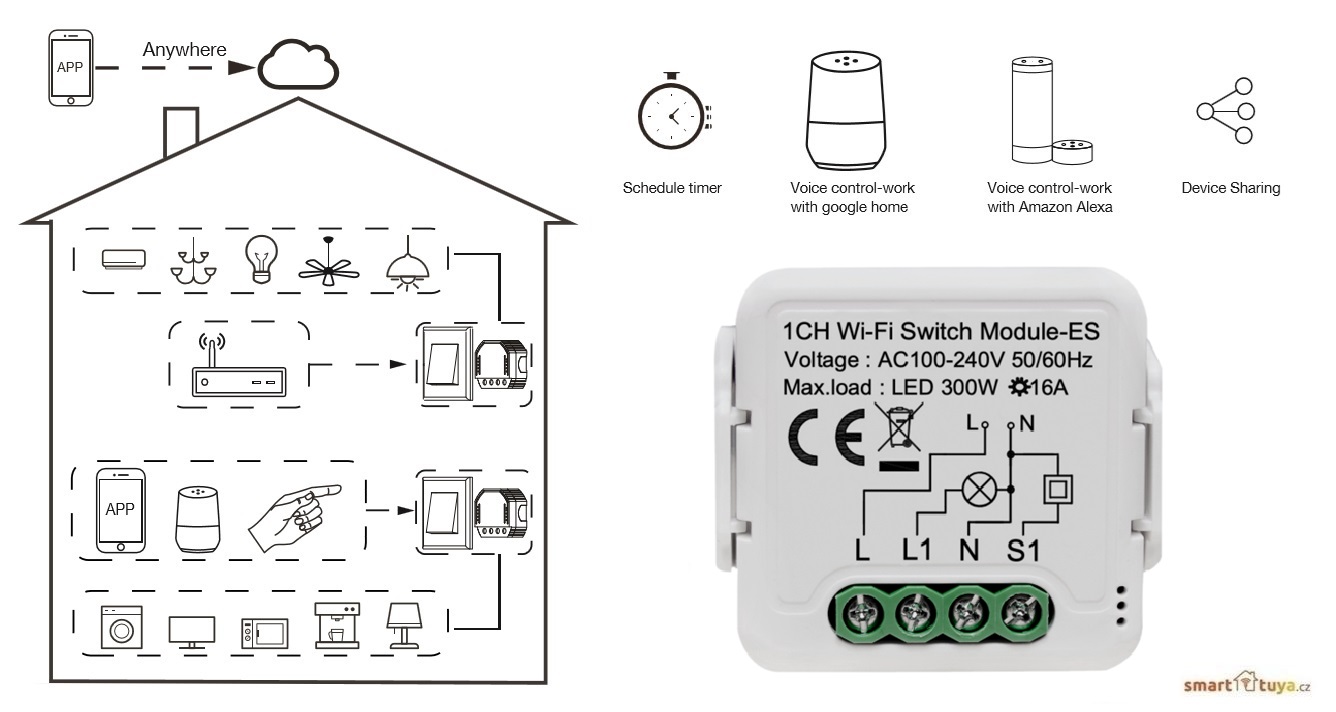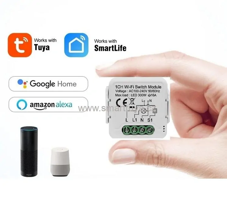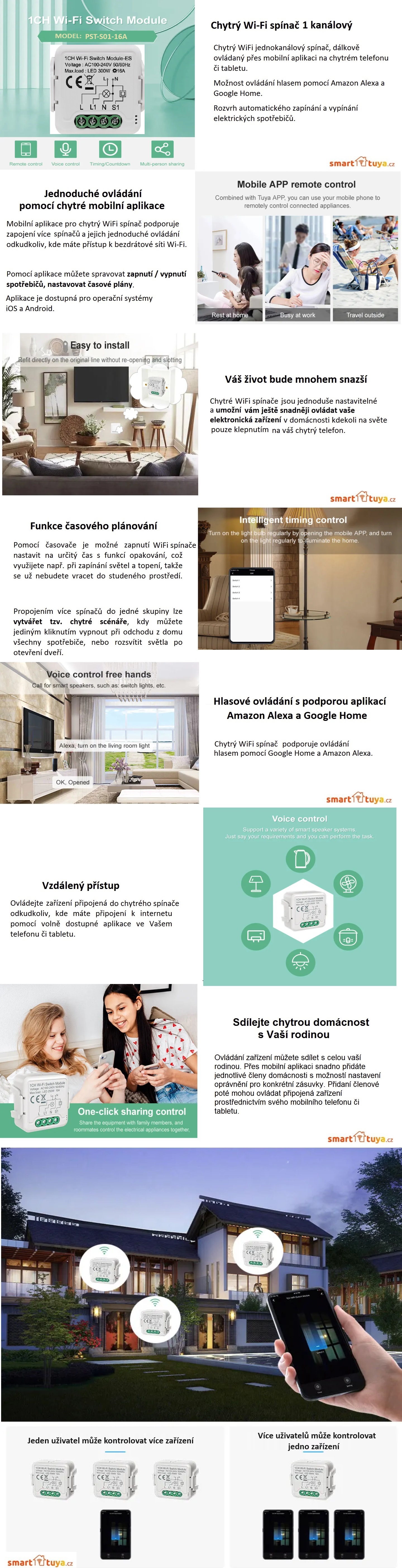 PST-S01-16AM= Mini vestavný jednokanálový spínač s měřením elektrické energie, dálkově ovládaný přes mobilní aplikaci na chytrém telefonu či tabletu, ovládání hlasem pomocí Amazon Alexa a Google Home, rozvrh automatického zapínání a vypínání elektrických spotřebičů.