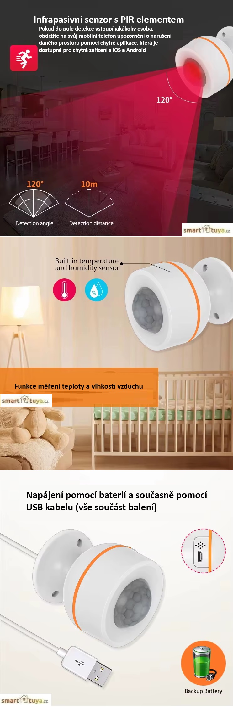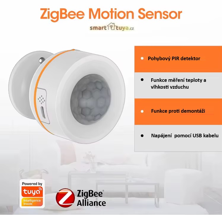- Zigbee pohybový PIR detektor s funkcí měření teploty a vlhkosti, napájení USB – TUYA, Android/iOS